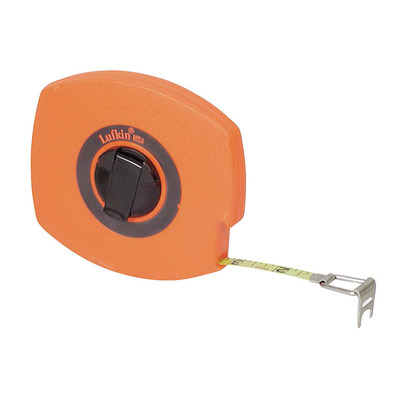 Lufkin® Tape Measure, High Visibility, Measuring System: Imperial/Metric, 100 ft Blade Length, 3/8 in Blade Width, 0.005 in Blade Thickness, Steel Blade, Graduations: 1/8ths, 1 mm, Black/Red Markings, 7 ft Standout, Crank Rewind, Non-Locking Locking, Folding Hook Ring Tape End, Closed Case, Orange Case, Yellow Clad® Blade