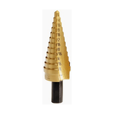 Irwin® Unibit® Step Drill, Fractional, Self-Starting, NO 4T, 3/16 in Minimum Hole Dia, 7/8 in Maximum Hole Dia, 12 Steps, 1/16 in Step Depth, 12 Hole Sizes, 1 Flutes, Tree Flute, 3/8 in Shank, Round with Flats Shank, SpeedPoint Point, HSS Cutting Edge, HSS, TiN Coated, Applicable Materials: Stainless Steel, Copper, Brass, Aluminum, Plastic and Laminates