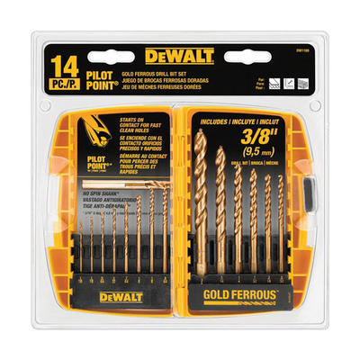 DeWALT® Drill Bit Set, High Performance, 14 Pieces, 3/8 in Drill Size, Straight Shank, Split Point, For Use With: DeWALT® Drills, HSS, Ferrous Oxide, Gold