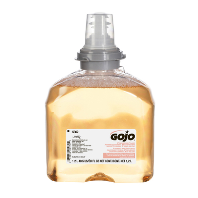 Gojo® Hand Sanitizer, Anti-Bacterial, Foam, Series: TFX™, 1200 mL Nominal Capacity, Dispenser Refill, Liquid, Clear/Amber/Brown, Fresh Fruit, Composition: Ethanol, Alpha-Sulfo-Omega-(dodecyloxy)-poly(oxy-1,2-ethanediyl), Ammonium Salt, Ammonium Dodecyl Sulphate, Propylene Glycol, 4-Chloro-3,5-Dimethylphenol, 4.5 - 8.5, 58.9 deg C Flash