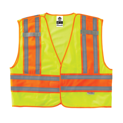GloWear® Safety Vest, Break Away, Two-Tone, Type P, Series: 8245PSV, 6XL/7XL, Hi-Viz Lime, Polyester Mesh, Orange/Silver Stripe, 64 - 70 in Chest, 15-1/4 in Length, Hook and Loop Closure, 1 Pockets, ANSI Class: Class 2
